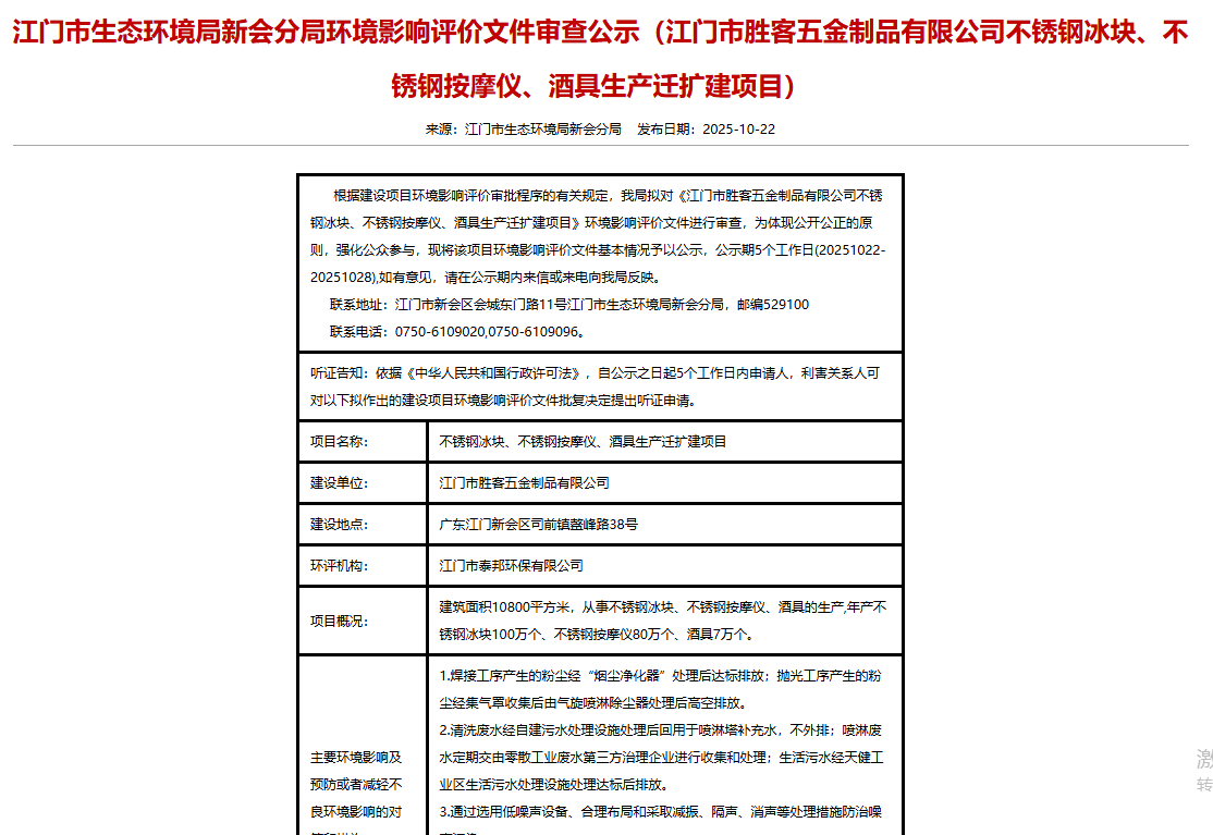 2025年10月22日,江門市生態(tài)環(huán)境局新會分局就江門市勝客五金制品有限公司不銹鋼冰塊、不銹鋼按 摩儀、酒具生產(chǎn)遷擴(kuò)建項(xiàng)目環(huán)境影響評價(jià)文件進(jìn)行審查公示,公示期:5個(gè)工作日。(來源:江門市生態(tài)環(huán)境局新會分局)聲明:以上內(nèi)容轉(zhuǎn)載自51不銹鋼網(wǎng),如有侵權(quán)請告知刪除。